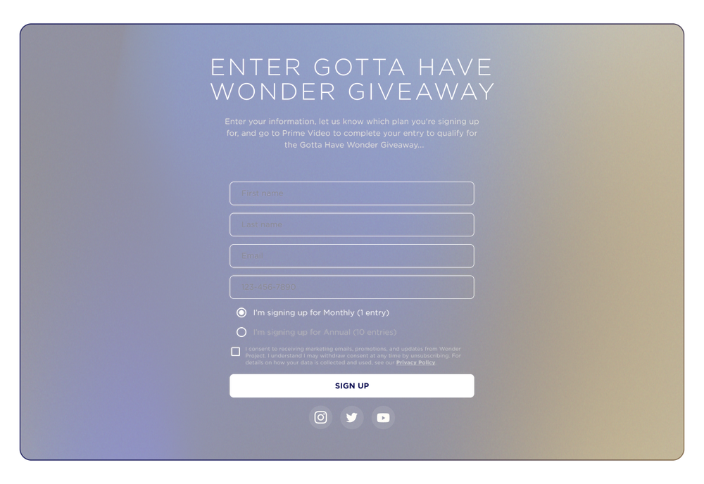 Enter your information, let us know which plan you're signing up for, and go to Prime Video to complete your entry to qualify for the Gotta Have Wonder Giveaway.